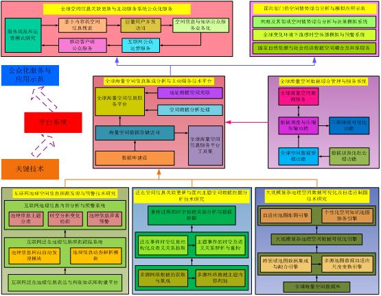 突破互联网地理信息获取处理与分析的统一信息模型、地理空间信息探测发现与主动分类、地理空间信息内容分析与安全诊断等核心技术,研发成套的互联网泛在空间信息探测发现的中间件,并构建多级联动的互联网地理空间信息探测发现系统。