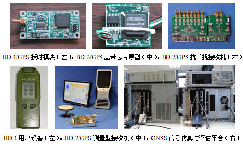 代表性的科研成果包括BD-1用户设备、BD-1无源定位授时模块、BD-2基本型用户设备、BD-2定时型用户设备、BD-2兼容型用户设备、BD-2/GPS基带信号处理集成电路原型、GPS/Galileo软件接收机、BD-2/GPS双频双模测量型接收机、BD-2/GPS高动态接收机、BD-2/GPS抗干扰接收机,以及BD-1高动态仿真器、BD-2/GPS信号源、多频多星座软件接收机平台、GNSS信号仿真与评估平台、GNSS射频兼容性仿真与评估软件平台等。